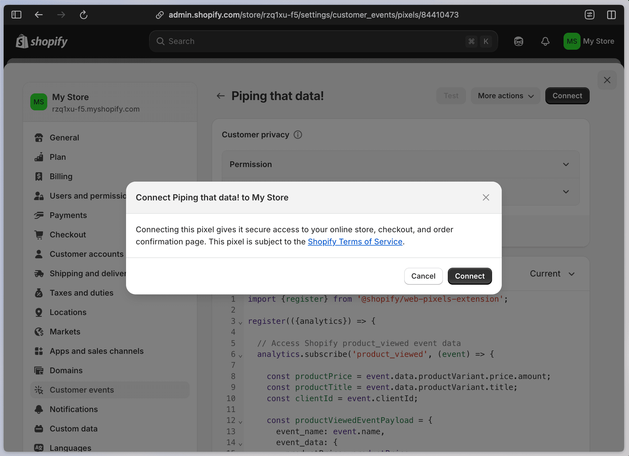 Click “Test” to confirm the Shopify Web Pixel API is connected (next, we’ll confirm Mixpanel is receiving those events from Shopify)
